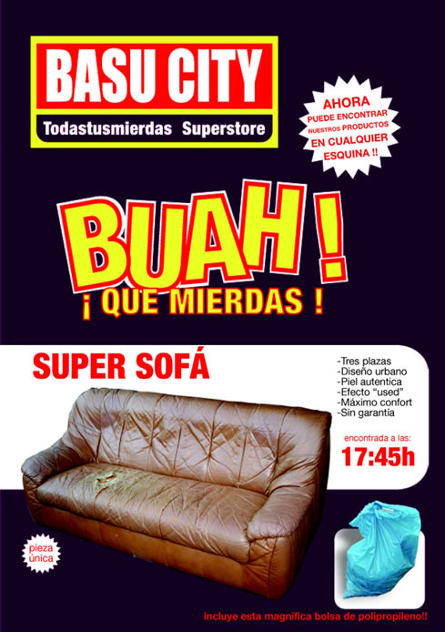 | 03 | Basu city por Alex Calvo Garro Memoria explicativa Por eso me he dado una vuelta con mi cámara por la ciudad, como quien va a unos grandes almacenes....y uno ve que los "productos estrella" se encuentran habitualmente tirados en cualquier esquina....o cuidadosamente colocados junto a un contenedor de basura. He tratado de ofertar esas cosas que nadie quiere siguiendo el mismo patrón que utiliza uno de los principales invasores de buzoneo publicitario etc..(de los que todos estamos hartos, al menos yo) y tratarlas como super ofertas que no te puedes perder. Memória técnica