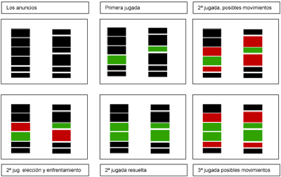 El jugador que gana una tirada se queda con la casilla remarcándola con un circulo o con una cruz, y en la siguiente beligerancia(¿?) decide con que anuncio continua el juego, tiene dos anuncios posibles con los que jugar, los situados en los extremos de su columna de juego, siempre en sentido vertical y sin saltar anuncios. Dentro de estos dos posibles anuncios elegirá los parámetros de las casas con los que quiere enfrentarse.