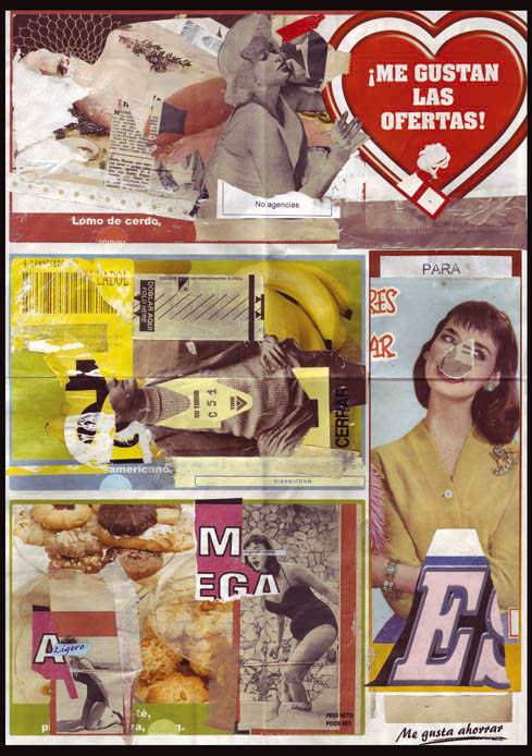 Collage sobre encarte de supermercado del que se aprovechan ciertas partes del diseño. Junto con pequeños trozos de materiales encontrados en las calles y una serie de imágenes extraídas de varias publicaciones, realizamos el nuevo diseño. Todo ello unido con pegamento y diferentes cintas adhesivas, que a su vez, han sido recogidas del mismo modo que el resto de componentes.