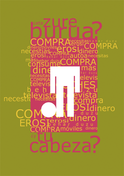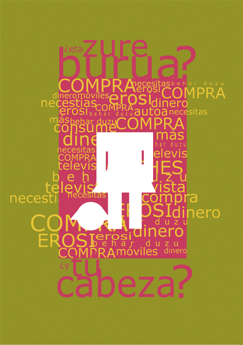 | 11 | Consumo imparable por Alberto Bueno Ormazabal Memoria explicativa Por eso en las gráficas he querido plasmar el constante bombardeo de publicidad y palabras que nos hacen llegar por todos los medios de comunicación, y no tener la suficiente “cabeza” o criterio como para gastar y consumir solo lo necesario, de hay la cabeza separada del cuerpo. Memória técnica |