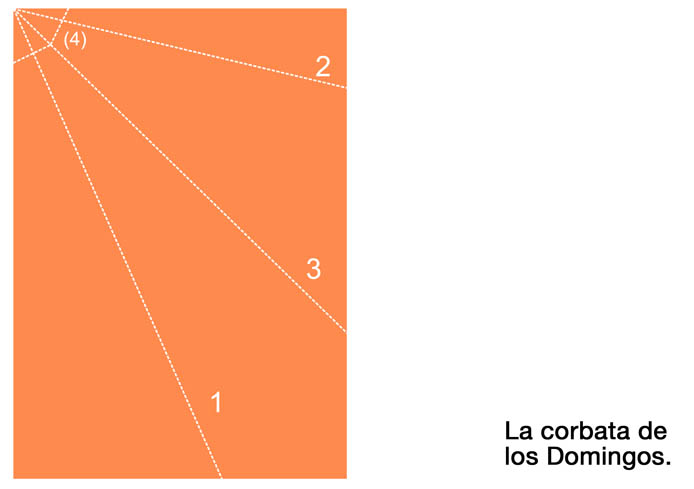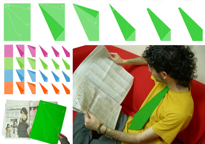 | 13 | La corbata de los Domingos por Rubén Lorenzo Montero Memoria explicativa ¿Qué mejor final de semana que cambiar de imagen un domingo cualquiera al comprar el periódico? Para ir a misa con clase, para dar una vuelta por el rastro con un aire diferente, para pasear al perro con elegancia, para leer el periódico con una mirada crítica... Memória técnica A3 de colores impresos por una cara (1 sola tinta gris clarita). En cada periódico se colocará un A3 de color . El propio objeto es auto-explicativo, es decir, las instrucciones para hacer la corbata es el propio objeto en sí. El A3 es la cobrata y las instrucciones a la vez. Son sólo 4 pasos. Todas las dobleces son hacia dentro para que la cara vista quede totalmente limpia. |