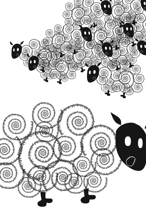 La colección de encartes se basa en esta espiral publicitaria, como elemento repetitivo, gráfico, que nos satura y que nos afecta en nuestras vidas. Son metáforas publicitarias, conceptos de posibles maneras de que esta publicidad nos afecte. Estamos habituados a sufrir tormentas publicitarias, nos llenan la cabeza de publicidad, la publicidad nos arrastra, hace que nos comportemos como borregos.
