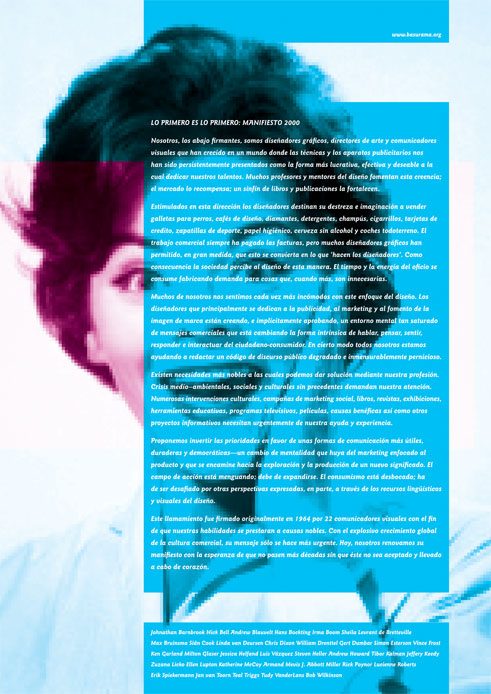 Manifiesto Nosotros, los abajo firmantes, somos diseñadores gráficos, directores de arte y comunicadores visuales que han crecido en un mundo donde las técnicas y los aparatos publicitarios nos han sido persistentemente presentados como la forma más lucrativa, efectiva y deseable a la cual dedicar nuestros talentos. Muchos profesores y mentores del diseño fomentan esta creencia; el mercado lo recompensa; un sinfín de libros y publicaciones la fortalecen. Estimulados en esta dirección los diseñadores destinan su destreza e imaginación a vender galletas para perros, cafés de diseño, diamantes, detergentes, champús, cigarrillos, tarjetas de credito, zapatillas de deporte, papel higiénico, cerveza sin alcohol y coches todoterreno. El trabajo comercial siempre ha pagado las facturas, pero muchos diseñadores gráficos han permitido, en gran medida, que esto se convierta en lo que ‘hacen los diseñadores’. Como consecuencia la sociedad percibe al diseño de esta manera. El tiempo y la energía del oficio se consume fabricando demanda para cosas que, cuando más, son innecesarias. Muchos de nosotros nos sentimos cada vez más incómodos con este enfoque del diseño. Los diseñadores que principalmente se dedican a la publicidad, al marketing y al fomento de la imagen de marca están creando, e implícitamente aprobando, un entorno mental tan saturado de mensajes comerciales que está cambiando la forma intrínsica de hablar, pensar, sentir, responder e interactuar del ciudadano-consumidor. En cierto modo todos nosotros estamos ayudando a redactar un código de discurso público degradado e inmensurablemente pernicioso. Existen necesidades más nobles a las cuales podemos dar solución mediante nuestra profesión. Crisis medio–ambientales, sociales y culturales sin precedentes demandan nuestra atención. Numerosas intervenciones culturales, campañas de marketing social, libros, revistas, exhibiciones, herramientas educativas, programas televisivos, películas, causas benéficas así como otros proyectos informativos necesitan urgentemente de nuestra ayuda y experiencia. Proponemos invertir las prioridades en favor de unas formas de comunicación más útiles, duraderas y democráticas—un cambio de mentalidad que huya del marketing enfocado al producto y que se encamine hacia la exploración y la producción de un nuevo significado. El campo de acción está menguando; debe de expandirse. El consumismo está desbocado; ha de ser desafiado por otras perspectivas expresadas, en parte, a través de los recursos lingüísticos y visuales del diseño. Este llamamiento fue firmado originalmente en 1964 por 22 comunicadores visuales con el fin de que nuestras habilidades se prestaran a causas nobles. Con el explosivo crecimiento global de la cultura comercial, su mensaje sólo se hace más urgente. Hoy, nosotros renovamos su manifiesto con la esperanza de que no pasen más décadas sin que éste no sea aceptado y llevado a cabo de corazón.
