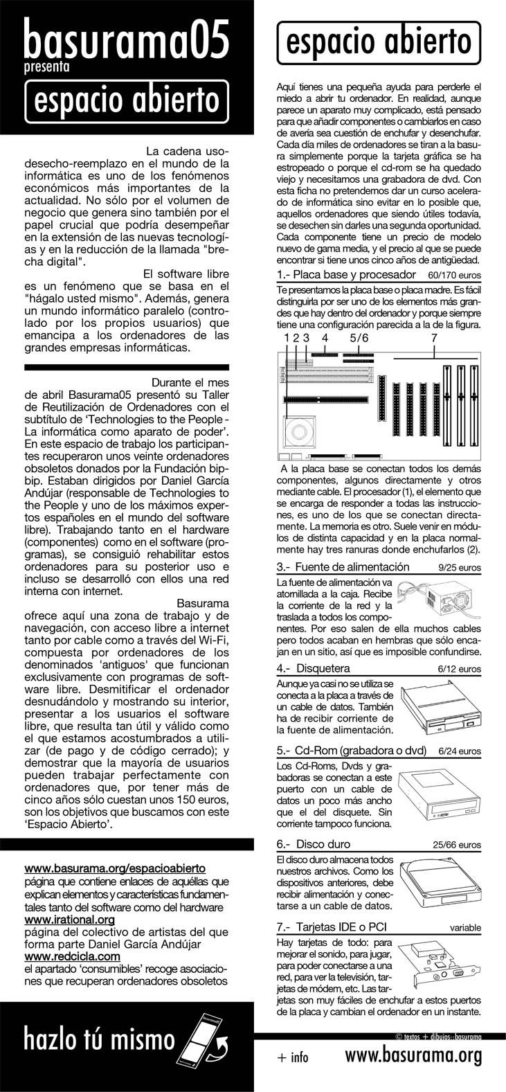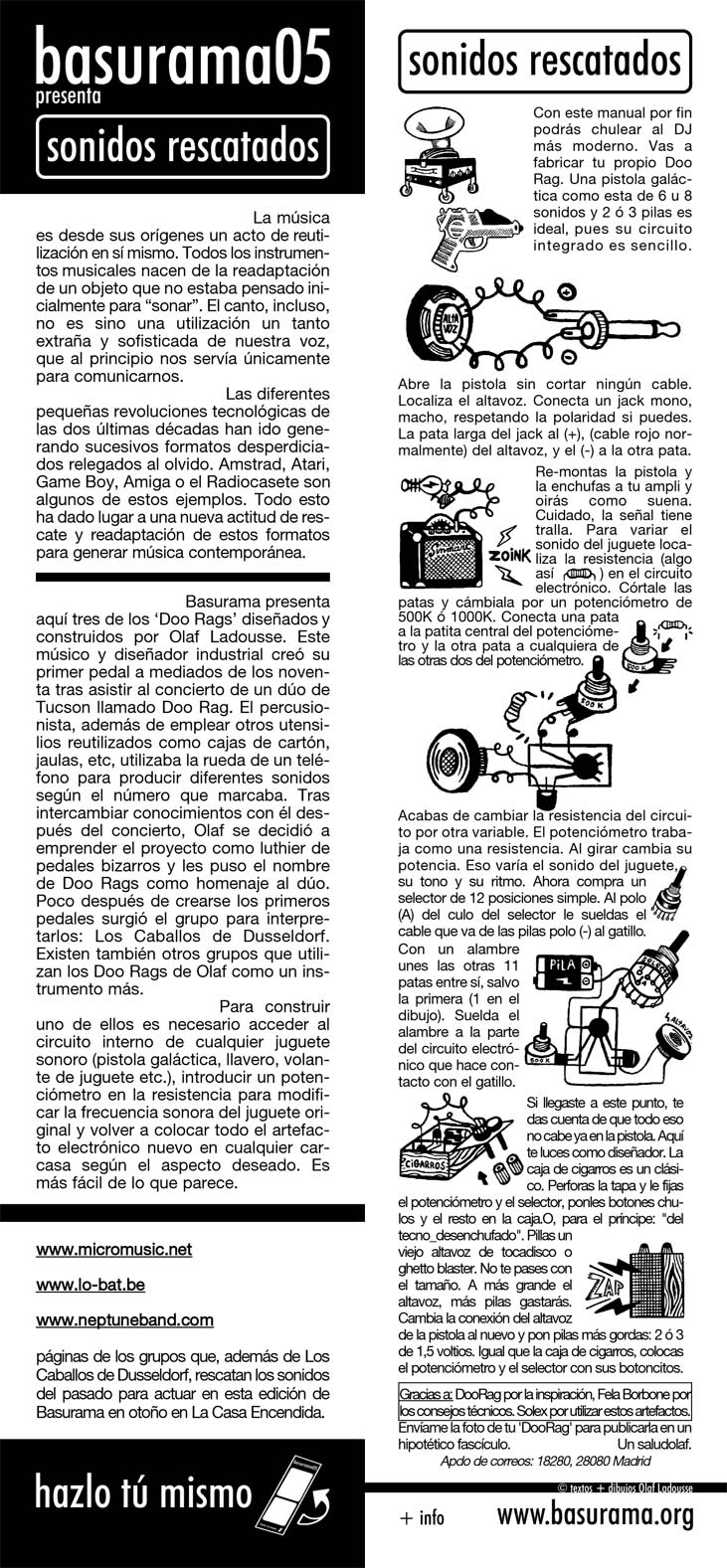 Basurama en Bastero La itinerancia de Basurama 2x1 en Guipúzcoa viene acompañada de una serie de actividades adicionales en forma de talleres, actividades de calle y concursos que funcionan como complemento de la exposición involucrando de forma directa a distintos comunidades del espectro social vasco. El epicentro de estas actividades es el Centro Cultural Bastero en Andoain donde, además de inaugurarse la exposición el día 18 de marzo (inicio de la itinerancia) se desarrollarán una serie de Talleres Didácticos Infantiles vinculados a la reutilización, así como Spermöla!, una plataforma de intercambio gratuito de objetos y curiosidades en el mercadillo de Anodain. Además Basurama presenta en colaboración con el periódico Noticias de Guipúzcoa el proyecto Ya En Tu Kiosko, un concurso abierto para diseñar y re-definir un encarte publicitario para el interior de un periódico con fines no publicitarios. El encarte servirá en esta ocasión para difundir el trabajo creativo de los participantes en el concurso e incentivar la reutilización. 12.00h | 18.03.06 | Inauguración. Cocktail Martín Berasategui El prestigioso cocinero guipuzcoano Martín Berasategui preparará para la inauguración de la Exposición 2x1 que tendrá lugar a las 12.00 horas en Bastero de Andoain, un sofisticado y creativo cocktail remezclando algunos ingredientes habitualmente sobrantes de la cocina (cáscaras de naranja, pieles de bacalao o pan) dándoles un nuevo uso.