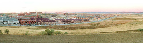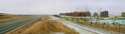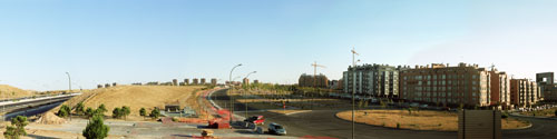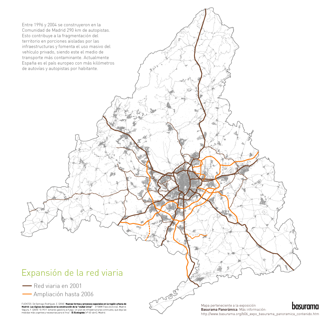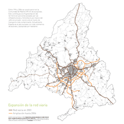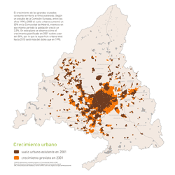 La reciente construcción del PAU de Sanchinarro es un claro ejemplo del modelo urbanístico actual: situado en la periferia urbana de Madrid se conecta a la capital y al resto de espacios urbanos mediante grandes infraestructuras, tiene un uso exclusivamente residencial, el sistema de comunicación interior se basa en grandes avenidas y rotondas y toda la oferta comercial y de ocio se concentra en una gran superficie que convierte la satisfacción de las necesidades diarias en una aventura. El resultado es un espacio discontinuo aislado del resto de la trama urbana por las mismas autopistas que lo conectan a ella, creando una isla residencial que se encierra en sí misma, una gran cantidad de espacio libre público sin cualificar y de poca calidad que excede las densidades reales de uso; unas calles vacías donde la escala del peatón es sustituida por la del automóvil, eje principal de los nuevos planes urbanísticos; y un exceso de protagonismo del centro comercial que concentra todas las actividades de la zona ahogando y rebajando intensidad al resto. Mapas de los crecimientos urbanísticos y infraestructuras en la Comunidad de Madrid:
