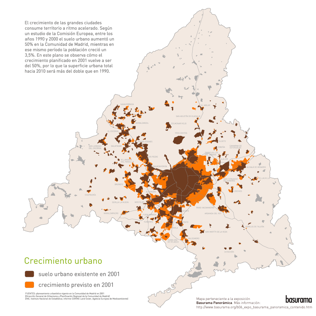 En esta sala se invita a reflexionar sobre el modelo de consumo y la forma de vida que está dando lugar a la expansión de las grandes ciudades, en particular en la región metropolitana de Madrid. Las grandes actuaciones de crecimiento urbanístico —PAUs y grandes vías de transporte como la M-50—, consideradas por sus ideólogos como un signo inequívoco de progreso, implican transformaciones profundas, de las que rara vez somos conscientes, en la concepción y uso de la ciudad, de los espacios públicos y de un bien tan singular como el suelo. Una consecuencia directa de este modelo de expansión, donde se tiende a construir nueva ciudad en lugar de mantener y regenerar la ya existente, es la generación de una mayor cantidad de residuos, nacidos todos ellos del consumo de más recursos naturales, en apariencia más intangibles (pero igual o más difíciles de renovar que el petróleo), tales como el suelo y el territorio. En este mismo sentido, la generación de basura, y con ella los vertederos y desguaces en sus distintas funciones de reciclaje, almacén y destrucción de la basura, es, por lo tanto, parte inseparable —aunque a menudo olvidada y hasta escondida—de este progreso: las cosas pasan a ser consideradas simplemente basura, despojadas de sus cualidades particulares. Basurama muestra en diez fotografías otros tantos ejemplos diferentes de estas situaciones urbanas y algunas de sus consecuencias. Al poder ser contempladas simultáneamente, es posible apreciar cómo todas ellas forman parte del mismo mecanismo de generación y transformación de basura: cómo las actuaciones urbanísticas presentadas, pretendidamente concebidas para los ciudadanos, funcionan despóticamente, olvidándose del habitante de las ciudades y favoreciendo con su diseño un modelo de ocupación del territorio que supone, en la práctica, una degradación de la ciudad consolidada. Ésta es progresivamente abandonada (por aquellos que pueden permitírselo) en pos de la urbanización perfecta de la periferia que, como si de la nueva Jerusalén se tratara, promete una vida idílica entre el chalet unifamiliar y el vehículo privado, lejos de la Babilonia caótica y perversa del centro. Sin embargo, los nuevos barrios esconden el inmenso coste que esta explosión urbanística supone para el entorno en el que se construyen. Además de un mapa de situación de los lugares fotografiados, la exposición se completa con otros tres mapas. En uno de ellos se muestra el crecimiento de los municipios de la Comunidad Autónoma de Madrid y en otro la proliferación de los kilómetros de sus carreteras. La falta de una planificación global territorial supone que cada municipio proyecte su expansión independientemente de los adyacentes, haciendo que el territorio se consuma de forma arbitraria. En el tercero se localizan los puntos relacionados con la basura en la ciudad, revelando la falta de vertederos de gestión pública. Por último, en el apartado de ‘Libros para el Estudio’, pueden encontrarse algunas lecturas para ayudar a comprender estos fenómenos. Sirva como referencia para entender el tamaño de cada una de las localizaciones el del Parque del Buen Retiro, de 118 hectáreas (ha).