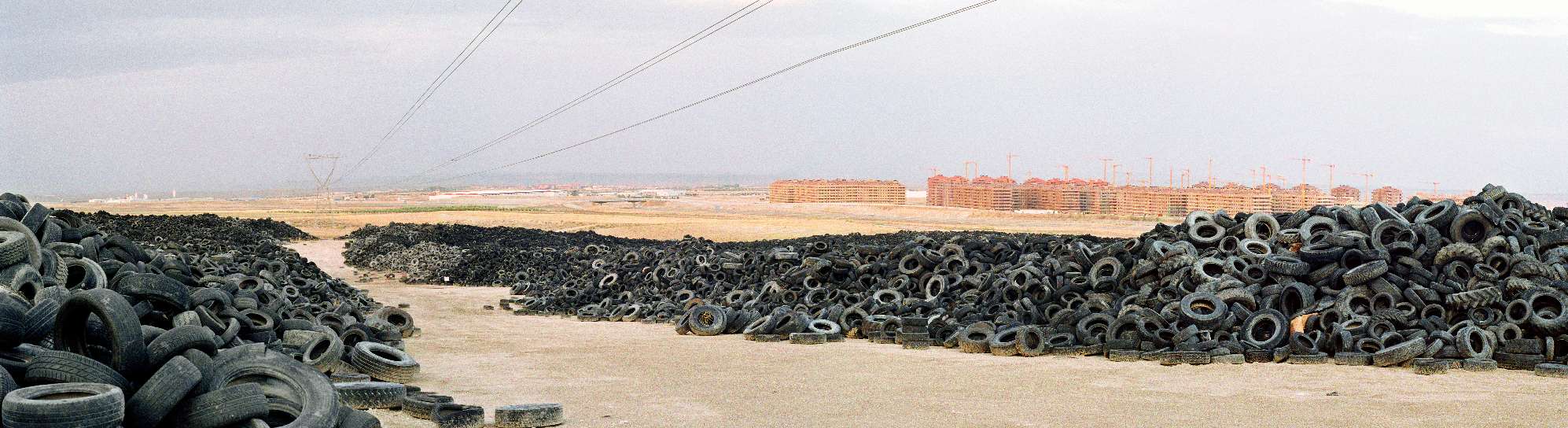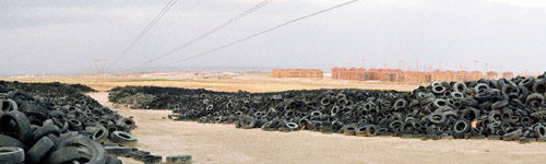 El neumático es el elemento más sofisticado, después de la electrónica, de la industria del automóvil. La complejidad de funciones que cumplen los neumáticos se traduce en una amplia diversidad en los materiales que los componen. El caucho es el la principal materia prima (un 50% del peso total), pero también contienen metal (15%) y, aproximadamente, otros 200 componentes entre los que se encuentra el azufre, elemento muy contaminante. En España se generan al año unas 300.000 toneladas de neumáticos (alrededor de 20 millones de unidades). En la Europa de los quince esta cifra alcanza las 3 millones de toneladas. Junto a la nueva urbanización de Seseña, al otro lado de la Radial 4, se encuentran estas montañas de neumáticos. Son aproximadamente 30.000 toneladas las que se acumulan tras un vallado metálico a la espera de ser tratadas. Un almacén al aire libre, que dada la alta capacidad de combustión de los neumáticos, puede dar lugar a un incendio difícil de apagar y muy contaminante. Para controlar estas y otras situaciones acaba de ser aprobado el Real Decreto para el tratamiento de neumáticos fuera de uso (NFU) que trata de controlar el ciclo completo de los neumáticos, apoyando, entre otras cosas, políticas basadas en la reutilización y que promuevan alargar su vida útil mediante el recauchutado, siempre huyendo de simples estrategias de combustión para conseguir energía.