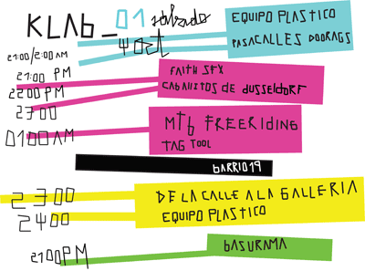 Talleres Modelando la Calle El taller se plantea como una serie de acciones de ocupación, apropiación y transformación del espacio localizadas en el contexto de la antigua estación de autobuses. Utilizando sencillos métodos de actuación (modificación del mobiliario existente, definición de límites abstractos mediante señalética, pequeñas intervenciones reversibles en el medio físico, etc.) es posible pensar el espacio de forma radicalmente diferente. Los grupos de trabajo definirán posible usos del espacio y plantearán posibilidades sobre como desarrollar las actividades y eventos que se llevarán a cabo a lo largo del fin de semana. Se anticipan y analizan los eventos que tendrán lugar y se contrastan las reflexiones e intervenciones con los efectos producidos a posteriori. De esta forma se trata de comunicar la programación del fin de semana a los participantes a la vez que se les hace participes de su configuración, desarrollo y resultados. El formato del taller es flexible y puede asumir diferentes flujos e intensidades en cuanto a participación e implicación. Se pretende hacer una reflexión sobre los modos de apropiación y uso no reglado del espacio de la estación como metáfora del espacio urbano a la vez que se desarrollan herramientas de intervención sencillas y efectivas sin condicionar ni degradar el medio en el que se actúa. Del mismo modo se pretende trasladar diagramáticamente la actividad que se genera a modo de traza o huella física. Web La página del evento es: Lugar Antigua Estación de Autobuses